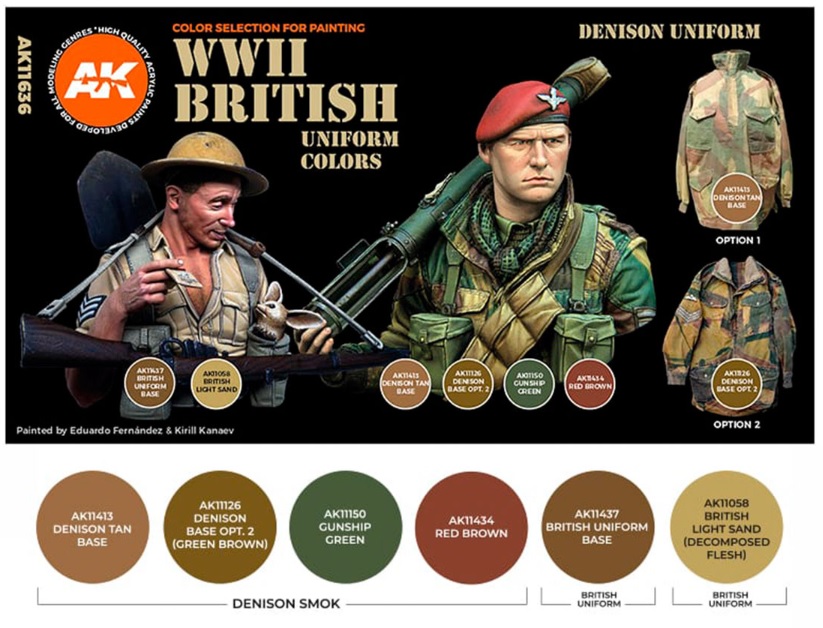 In diesem Set finden Sie alle notwendigen Farben, um alle einfarbigen Uniformen der britischen Bodentruppen und alle damals verwendeten Tarnmuster, wie z. B. das Denison-Muster, zu bemalen.